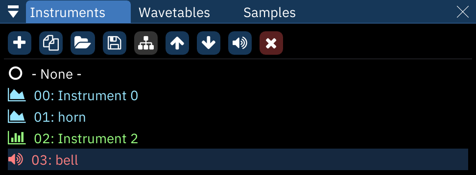 at the top of the interface, just right of center, is the instrument list. there are also tabs for wavetables and samples, but we'll get to those later. just like physical instruments, these define the sounds we can use in the track. unlike physical instruments, these sounds can be endlessly redefined.
