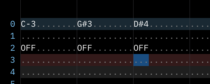 about ten rows after the last note in our song, place a note off. the final note rises to maximum, then is suddenly cut off! to get the rest of the macro to play, move your cursor over the note off and use the ~