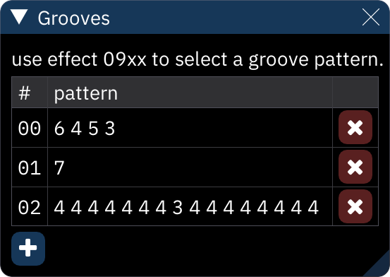 • the + button adds a new groove pattern; click in the groove pattern to edit it.