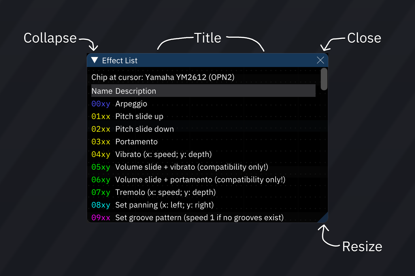 when a window is docked, its title bar turns into a tab bar, and the function provided by the "collapse" triangle at the top left changes.