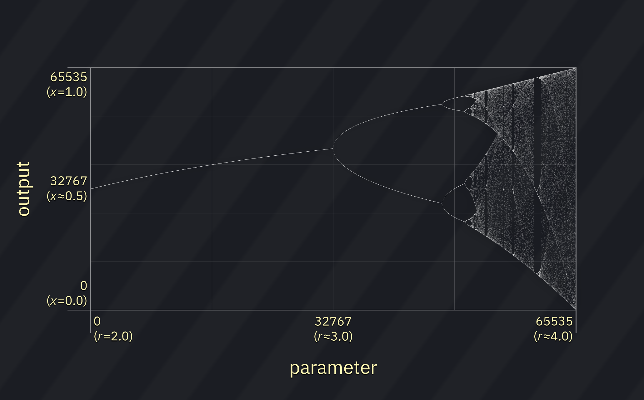 in Bifurcator the current output (and initial "load value") ranges from 0 to 65535, which maps directly to x in the range 0.0 to 1.0. the parameter ranges from 0 to 65535, which maps directly to r in the range 2.0 to approximately 4.0.